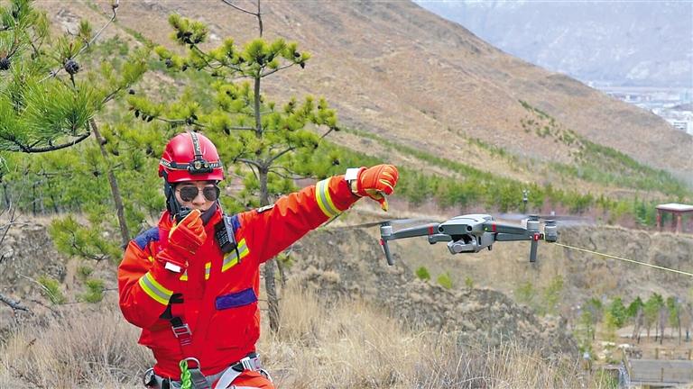 圖為拉薩市消防救援隊(duì)伍利用無(wú)人機(jī)開(kāi)展偵察測(cè)繪、喊話照明、物資投送等集群化作業(yè)。
