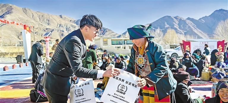 德薩村駐村工作隊隊員為群眾發(fā)放法治宣傳物品。張夢琦 扎西頓珠 攝