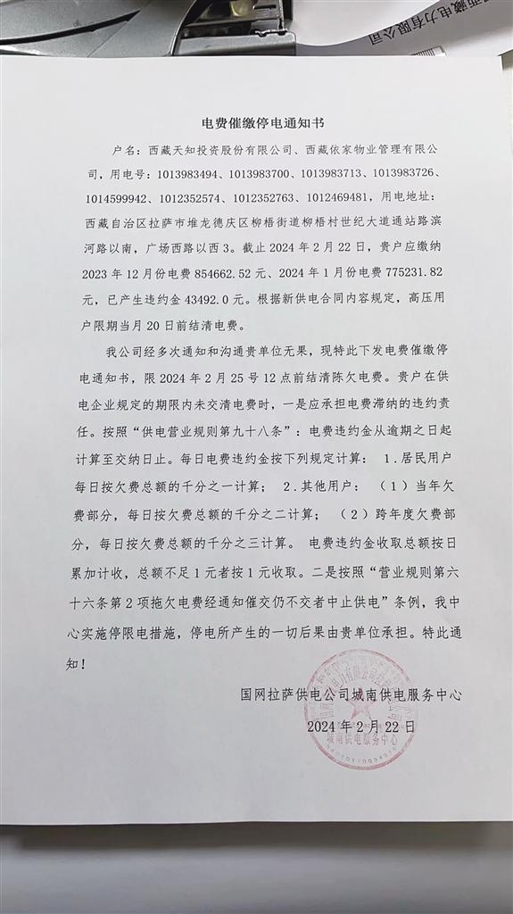 記者從國網拉薩供電公司城南供電服務中心了解到,上述5個小區(qū)均由同一家物業(yè)公司負責代收電費,2024年1月份、2月份的電費皆未繳納,涉及電費逾百萬元。供電公司于2月份、3月份連續(xù)向該物業(yè)公司發(fā)布《電費催繳停電通知書》,通知書明確:“請您在接到本通知后,務必于最后繳費日期2024年3月31日12:30之前,前往我公司指定的繳費地點或通過網絡平臺完成電費繳納工作。逾期未繳,2024年3月31日13:00采取停限電措施,所產生的一切后果由貴單位承擔?!钡刂?月31日12:30,該物業(yè)公司仍未繳費,才導致了小區(qū)被斷電。