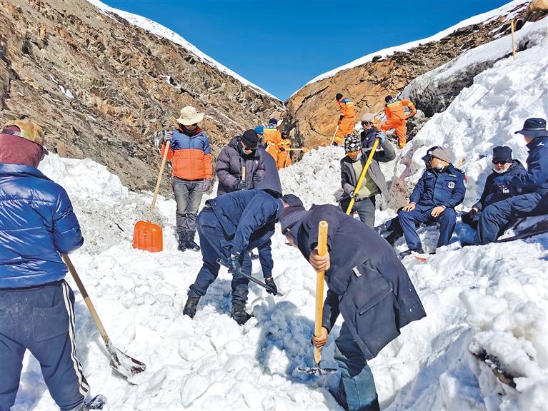2022年10月底,洛扎縣突降大雪,農(nóng)牧民群眾的生命財產(chǎn)安全受到嚴(yán)重威脅,堅增羅布又一次向組織申請,主動前往自己熟悉的色鄉(xiāng)曲吉麥放牧點參與緊急救援工作。他在山谷中鏟雪、碎冰、清理河道,連續(xù)奮戰(zhàn)12天,竭力尋找失蹤牧民,成功轉(zhuǎn)運200多頭牦牛,最大限度維護了群眾生命財產(chǎn)安全。
