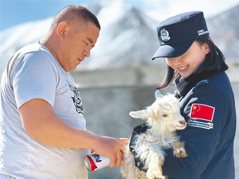 圖為日土邊境派出所民警李泉嫻(右)幫助村民給小羊羔噴標記。 本報記者 張宇 本報通訊員 任博 攝
