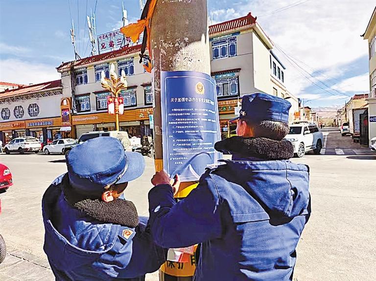 圖為噶爾縣消防救援大隊(duì)消防宣傳員在街頭巷尾張貼電動(dòng)自行車消防安全海報(bào)。