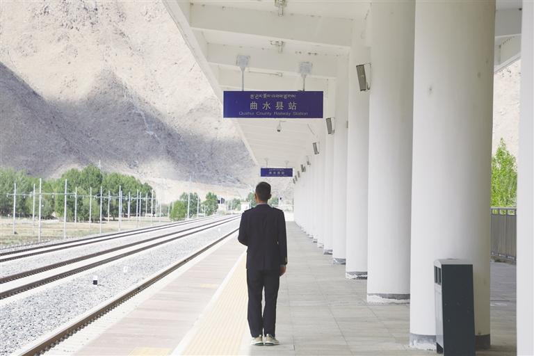 每天,清晨的第一縷陽光還未穿透遠方的山巒時,車站值班員賀文貴已經(jīng)站在曲水站的站臺上,開始了他日復一日的工作,查看股道是否有異物,是否有動物進入站場。曲水站與其他站不一樣,根據(jù)工作安排,平時這里只有一個人當班應(yīng)急值守,沒有旅客上下站,時而駛過的火車,是這里唯一的來客。目之所及,只有遠處的雪山、農(nóng)田和滾滾向前的雅魯藏布江水。