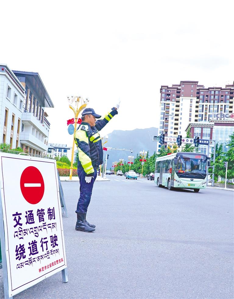圖為林芝市公安交警在考場周圍指揮交通,維護安全有序的考場周邊交通環(huán)境。