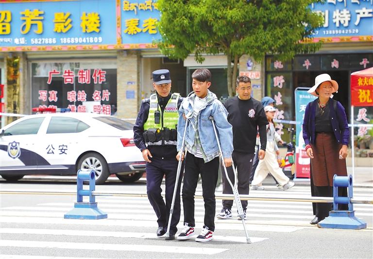 圖為林芝市公安民警幫助行動有困難的考生順利到達考場。