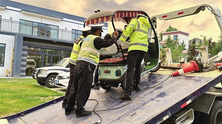 6月19日18時(shí)許,記者來(lái)到拉薩市城關(guān)區(qū)江蘇東路與嘎瑪貢桑路交叉口,此時(shí)正值下班高峰期,各類車輛川流不息,十分繁忙,拉薩市公安局交警支隊(duì)城南大隊(duì)的民警們一邊疏導(dǎo)交通,一邊開(kāi)展電動(dòng)三輪、四輪車專項(xiàng)整治行動(dòng)。沒(méi)過(guò)多久,一輛電動(dòng)三輪車準(zhǔn)備通過(guò)路口,民警丹增發(fā)現(xiàn)該車輛存在非法改裝現(xiàn)象,便立即上前將車輛引導(dǎo)至安全位置,檢查后發(fā)現(xiàn)駕駛?cè)怂阶詾檐囕v加裝遮陽(yáng)篷,上路行駛存在較大安全隱患,便按照相關(guān)法律法規(guī)暫扣車輛。丹增告訴記者:“我們會(huì)將暫扣的車輛統(tǒng)一停放,等駕駛?cè)私邮芴幜P并提交相關(guān)資料后,才能領(lǐng)回車輛?!?/p>