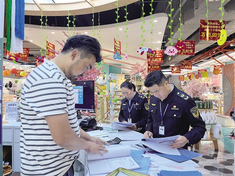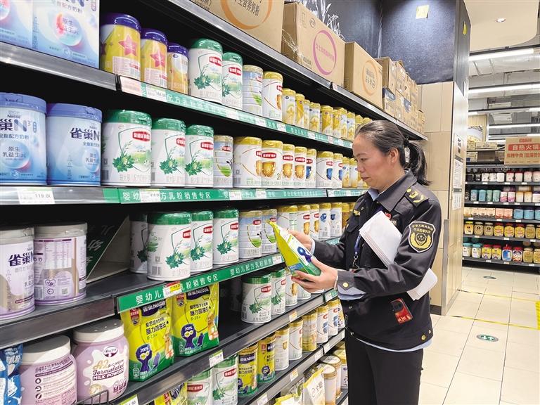 執(zhí)法人員對(duì)永輝超市(城關(guān)萬(wàn)達(dá)廣場(chǎng)店)嬰幼兒配方乳粉進(jìn)行檢查。
