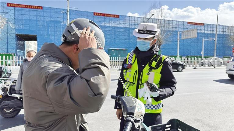 民警讓電動(dòng)自行車(chē)駕駛員佩戴安全頭盔。