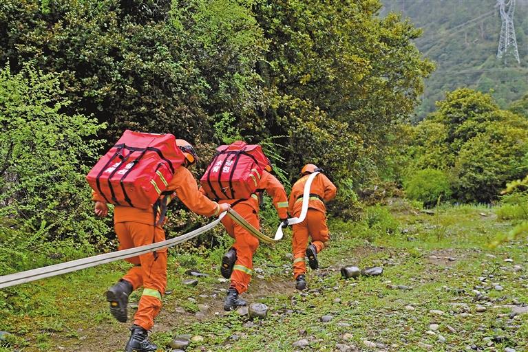 圖為森林消防員在鋪設(shè)管帶。 記者 胡文 攝