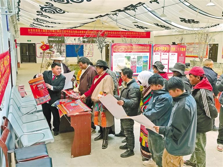 那曲市雙湖縣措折羅瑪鎮(zhèn)第三屆“鄉(xiāng)村振興 那曲奮進(jìn)”活動(dòng)中,法庭干警(左一)向群眾進(jìn)行普法宣傳。(圖片均由記者彭琦 攝)