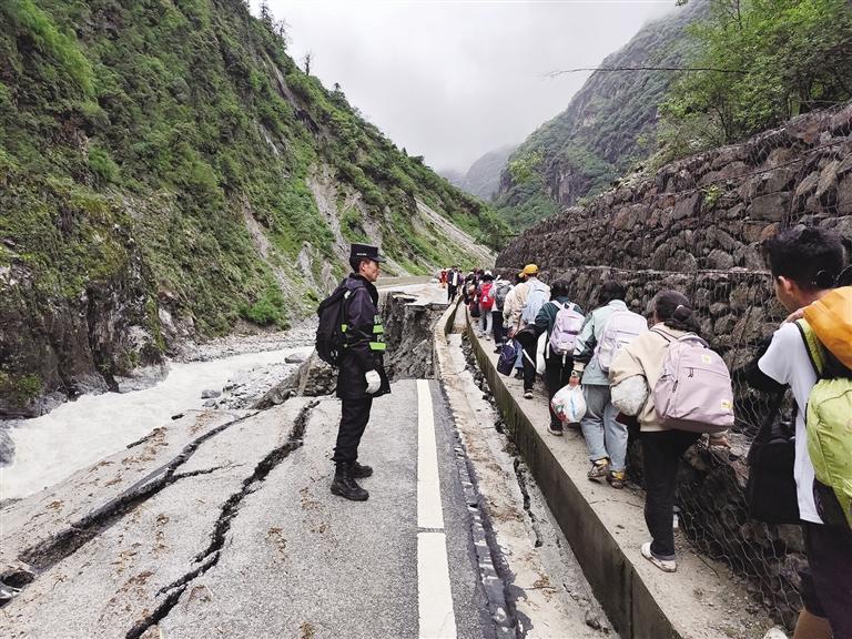 日前,由于連降暴雨,日喀則市定結(jié)縣日屋鎮(zhèn)至陳塘鎮(zhèn)方向(省道514線)沿途出現(xiàn)多處嚴(yán)重塌方,道路損毀嚴(yán)重、電力和通信中斷,100余名外來(lái)游客和務(wù)工經(jīng)商人員被困。由于電力、通信中斷,滯留人員無(wú)法與外界取得聯(lián)絡(luò)。人民群眾生命財(cái)產(chǎn)受到極大威脅的危急時(shí)刻,為確保滯留人員人身和財(cái)產(chǎn)安全,定結(jié)邊境管理大隊(duì)立即啟動(dòng)應(yīng)急預(yù)案,抽調(diào)民輔警骨干力量成立救援突擊隊(duì),協(xié)同定結(jié)縣人民政府和縣公安局、消防救援大隊(duì)等部門開展救援轉(zhuǎn)移工作。