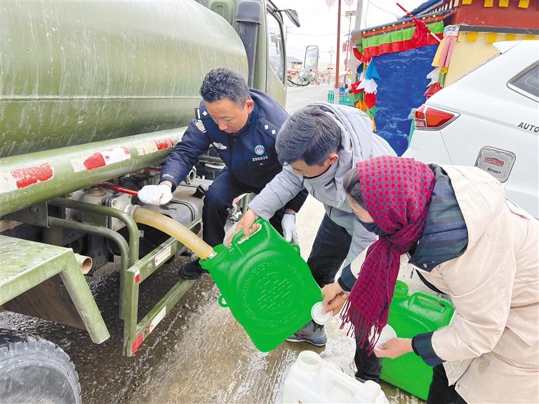 每年10月后,阿里地區(qū)便進(jìn)入漫長(zhǎng)的冬季。巴嘎鄉(xiāng)崗莎村因塔爾欽曲河道結(jié)冰,當(dāng)?shù)厝罕娚钣盟掷щy。塔爾欽邊境派出所組建黨員服務(wù)小分隊(duì),每周都會(huì)按時(shí)調(diào)用水車從水井抽水,為轄區(qū)居民集中送水。
