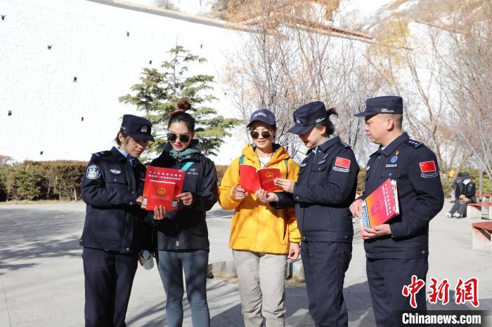 圖為西藏邊檢總站執(zhí)法調(diào)查支隊(duì)法制民警向游客普及憲法知識(shí)。徐錫萬 攝