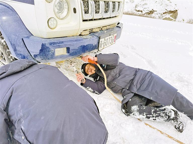 竹瓦根邊境派出所民警臥雪掛牽引繩救援被困車輛。通訊員 朱孟邦 攝