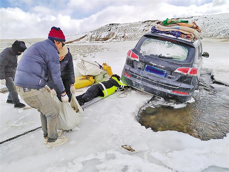 圖為聶榮縣公安局桑榮鄉(xiāng)派出所民警救助陷入結(jié)冰河道的車(chē)輛。