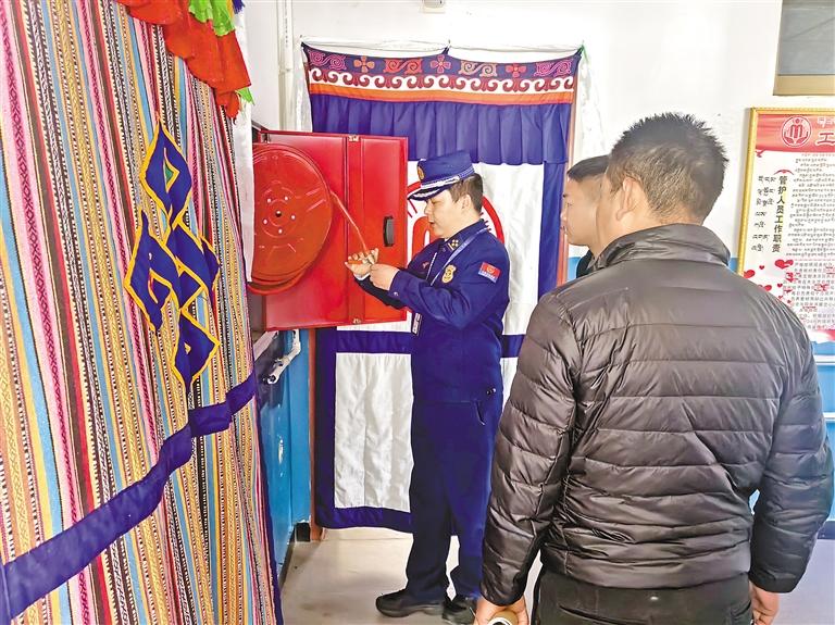 林芝市墨脫縣消防救援大隊(duì)宣傳人員檢查養(yǎng)老機(jī)構(gòu)微型消防站的消防器材。 通訊員 才旺多吉 攝