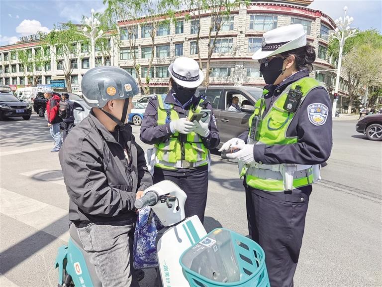 “騎乘電動車請戴好頭盔?!薄靶腥诉^馬路不要闖紅燈?!?月27日下午,記者來到拉薩市江蘇路、金珠東路、康昂多南路三岔口,看到拉薩市公安局交警支隊城北大隊的民警正在路口疏導交通,并針對電動車駕駛員未佩戴安全頭盔等情況,進行現(xiàn)場查糾。
