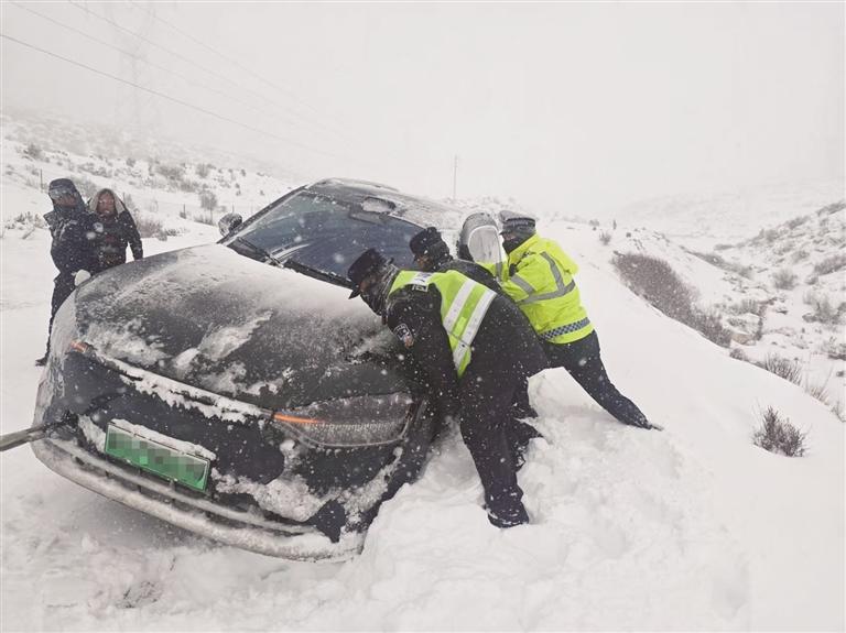 次日上午,業(yè)拉山路段一輛面包車因打滑深陷路邊溝谷,車內(nèi)兒童被凍得哭鬧不止,孩子母親急得直掉眼淚。民警吳紹軍見狀,立即脫下自己的警用大衣裹住孩子,耐心安撫一家人的情緒,隨后背起孩童,深一腳淺一腳地在積雪中跋涉,將一家人安全轉(zhuǎn)移至溫暖區(qū)域。