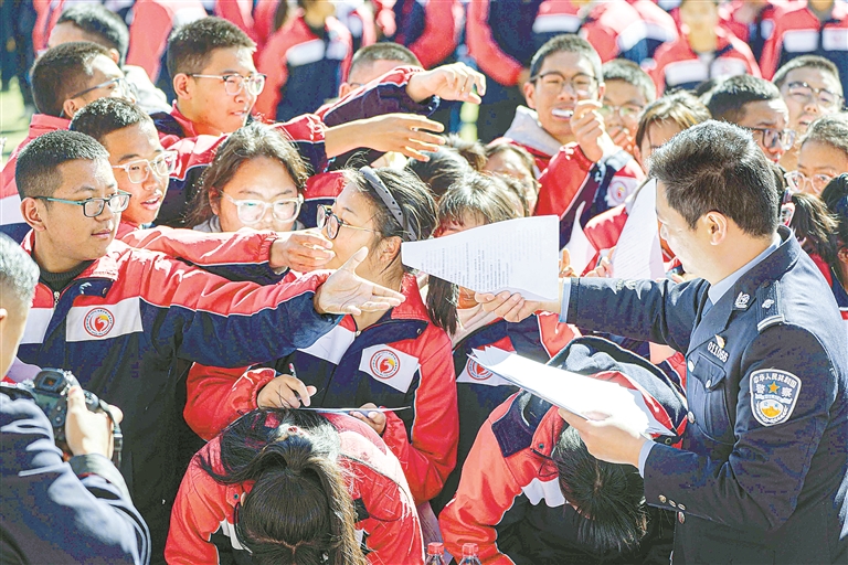 圖為西藏“開學(xué)第一課”網(wǎng)絡(luò)普法進(jìn)校園活動中,民警為學(xué)生發(fā)放普法宣傳知識手冊(資料圖片)。記者 貢曲羅杰 攝
