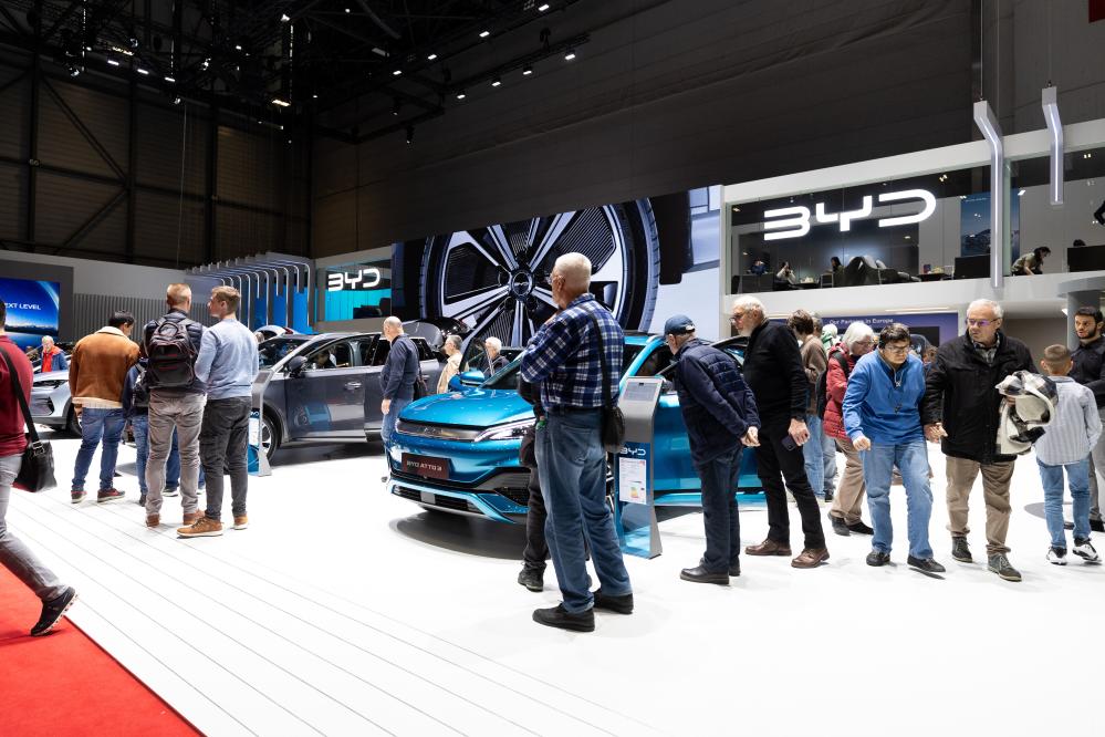 這是2月28日在瑞士日內(nèi)瓦舉行的2024年日內(nèi)瓦國際車展上拍攝的比亞迪展臺(tái)。新華社記者孟鼎博 攝