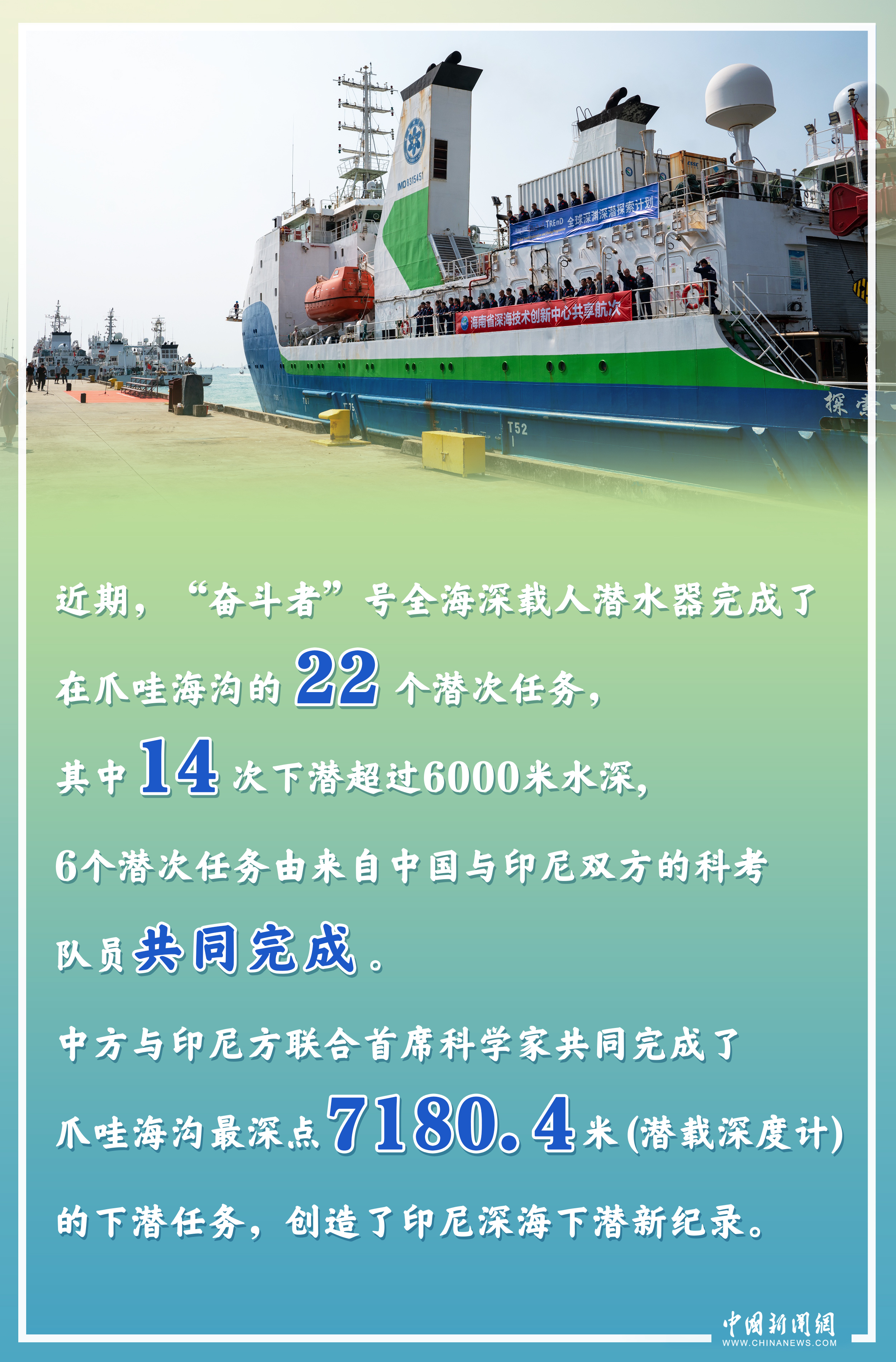 近期,“探索一號”科考船搭載著“奮斗者”號全海深載人潛水器,圓滿完成首次中國-印度尼西亞爪哇海溝聯(lián)合深潛科考航次任務(wù),創(chuàng)造了印尼深海下潛新紀(jì)錄,為兩國加強(qiáng)海洋合作,開啟了新篇章。