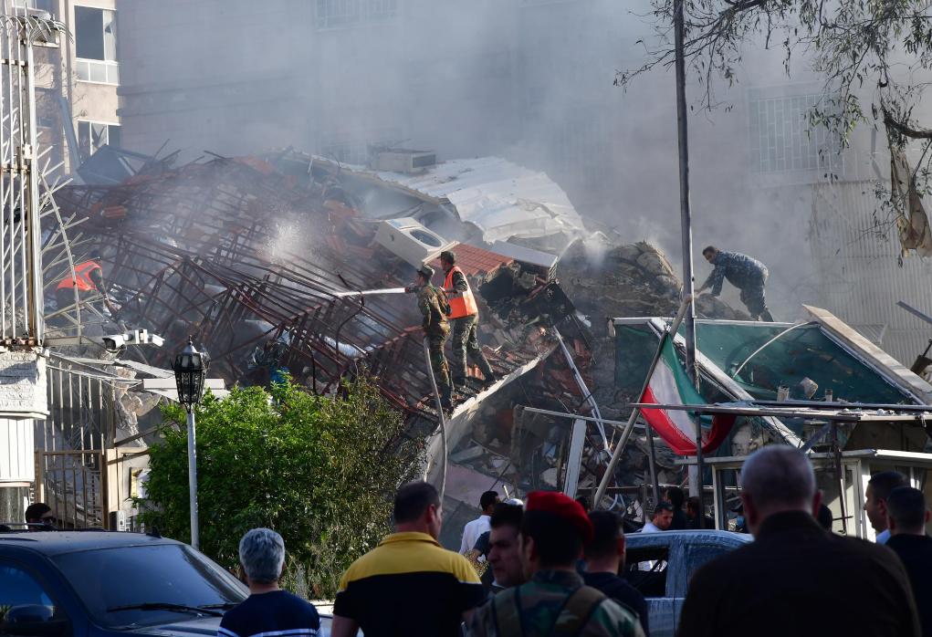4月1日,在敘利亞首都大馬士革,救援人員在伊朗駐敘使館遭襲現(xiàn)場搜救。新華社發(fā)(阿瑪爾攝)
