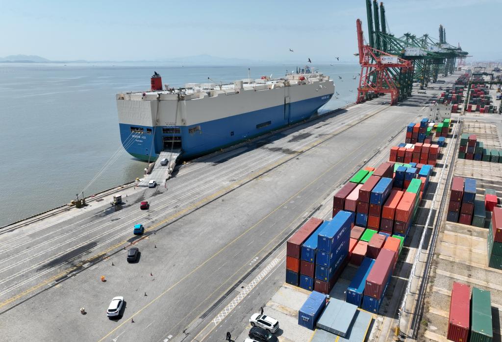 3月12日,準備出口的車輛從福州港江陰港區(qū)碼頭駛上遠洋滾裝輪(無人機照片)。新華社記者林善傳攝