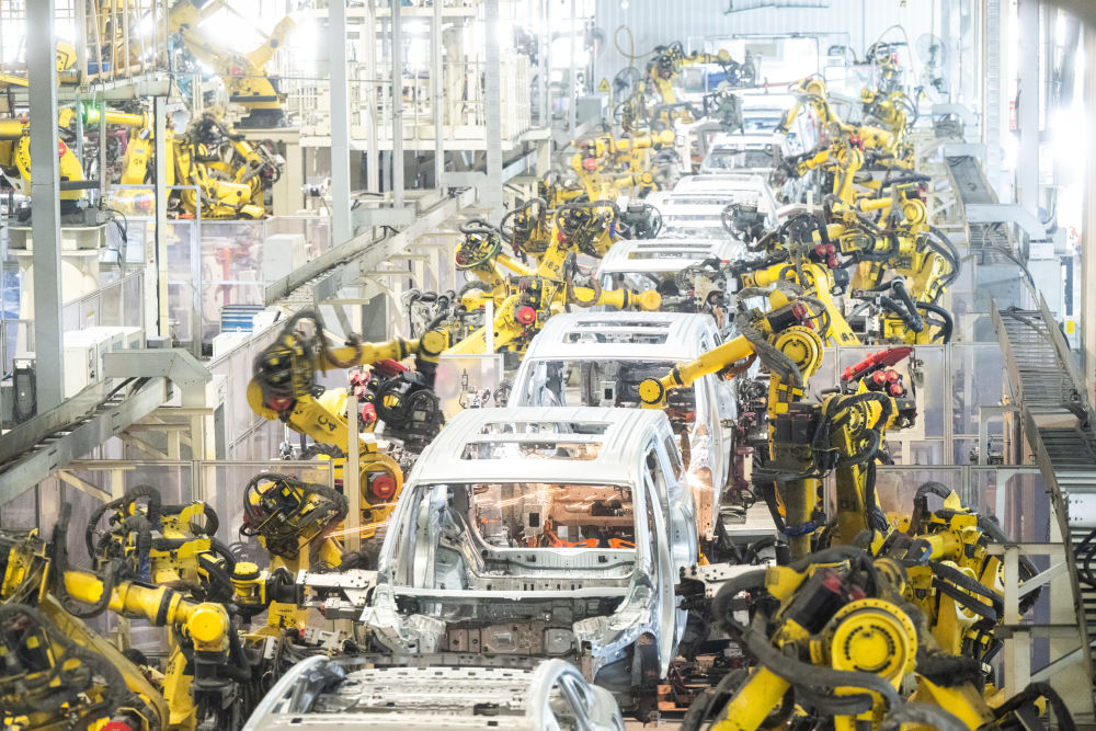 4月1日,在位于湖北武漢經(jīng)開區(qū)的嵐圖汽車電動(dòng)化焊裝車間,機(jī)器人在流水線上作業(yè)。新華社記者肖藝九攝