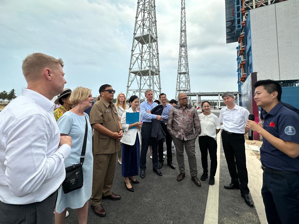 圖為駐華使節(jié)在海南國(guó)際商業(yè)航天發(fā)射中心聽(tīng)講解。新華社記者 袁睿 攝