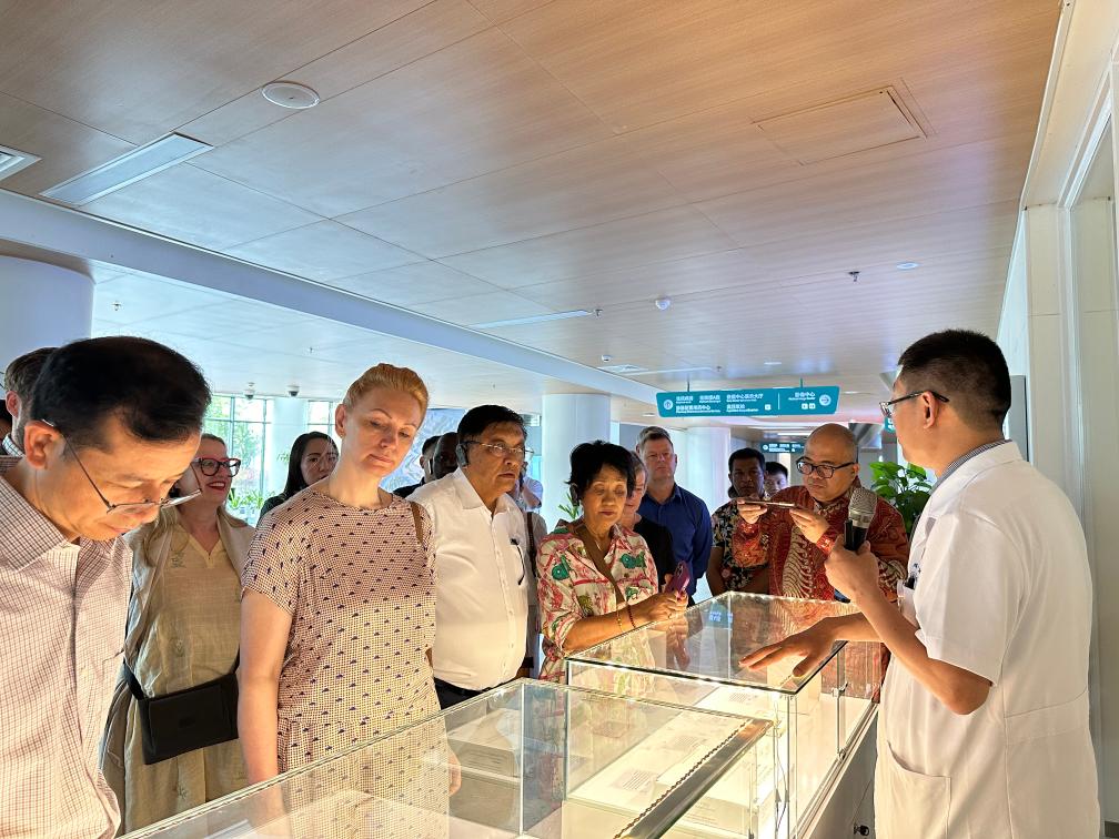 圖為駐華使節(jié)在博鰲樂(lè)城國(guó)際醫(yī)療旅游先行區(qū)里的一家醫(yī)院內(nèi)考察。新華社記者 袁睿 攝