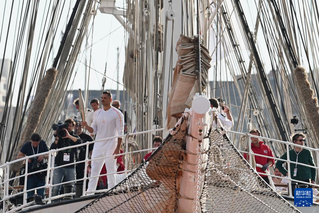 ??在“貝勒姆”號(hào)靠岸后,馬賽交響樂團(tuán)開始演奏巴黎奧運(yùn)會(huì)主題曲《巡游盛典》。約19時(shí)30分,2012年倫敦奧運(yùn)會(huì)游泳冠軍弗洛朗·馬諾杜作為在法國(guó)本土的第一棒火炬手,手持火炬從“貝勒姆”號(hào)上走下,象征著奧運(yùn)火種正式登陸法國(guó)。