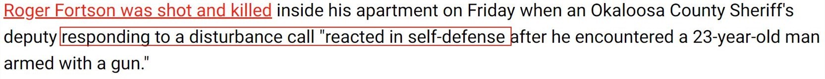 佛羅里達州奧卡魯沙縣警察局在事后發(fā)表的聲明中稱,涉事警察在案發(fā)當天接到有關“擾亂公共秩序”的報警,后來在看到福特森持槍時出于“自衛(wèi)”才開火。
