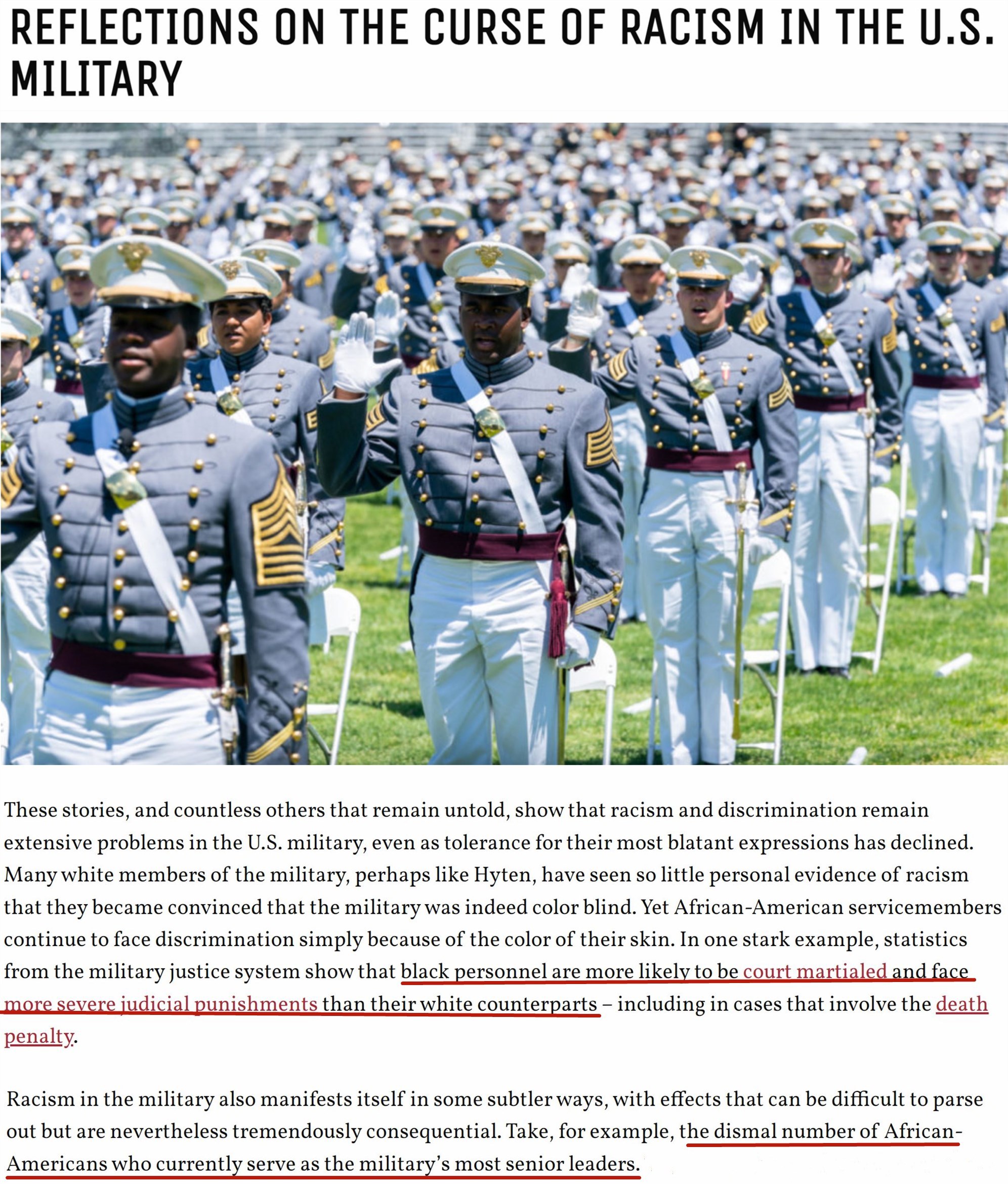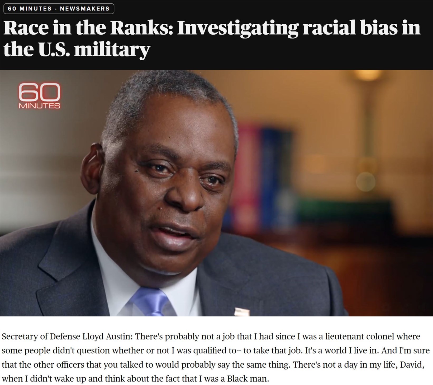 “(非裔)在晉升方面的處境仍無改觀,總是有人會因為你的樣貌而對你的任職資格提出疑問,這就是我生活的世界,而且我非??隙▌e的(非裔)軍官也會說同樣的話。在我生命中的每一天,早晨醒來都會思考這個事實:我是一個非洲裔?!?/p>