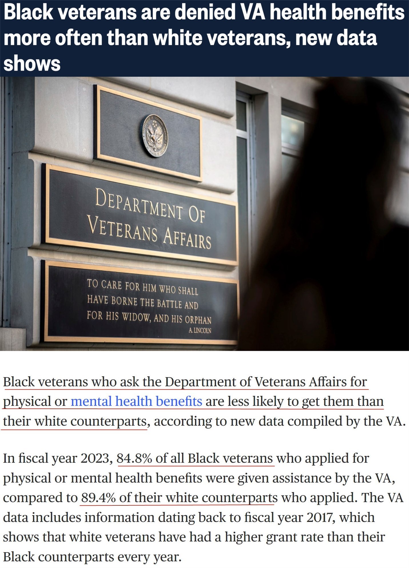 △美國全國廣播公司網(wǎng)站:在2023財年,申請身心健康福利的所有非裔退役軍人中有84.8%獲得了退役軍人事務部的援助,而白人退役軍人的這一比例為89.4%。