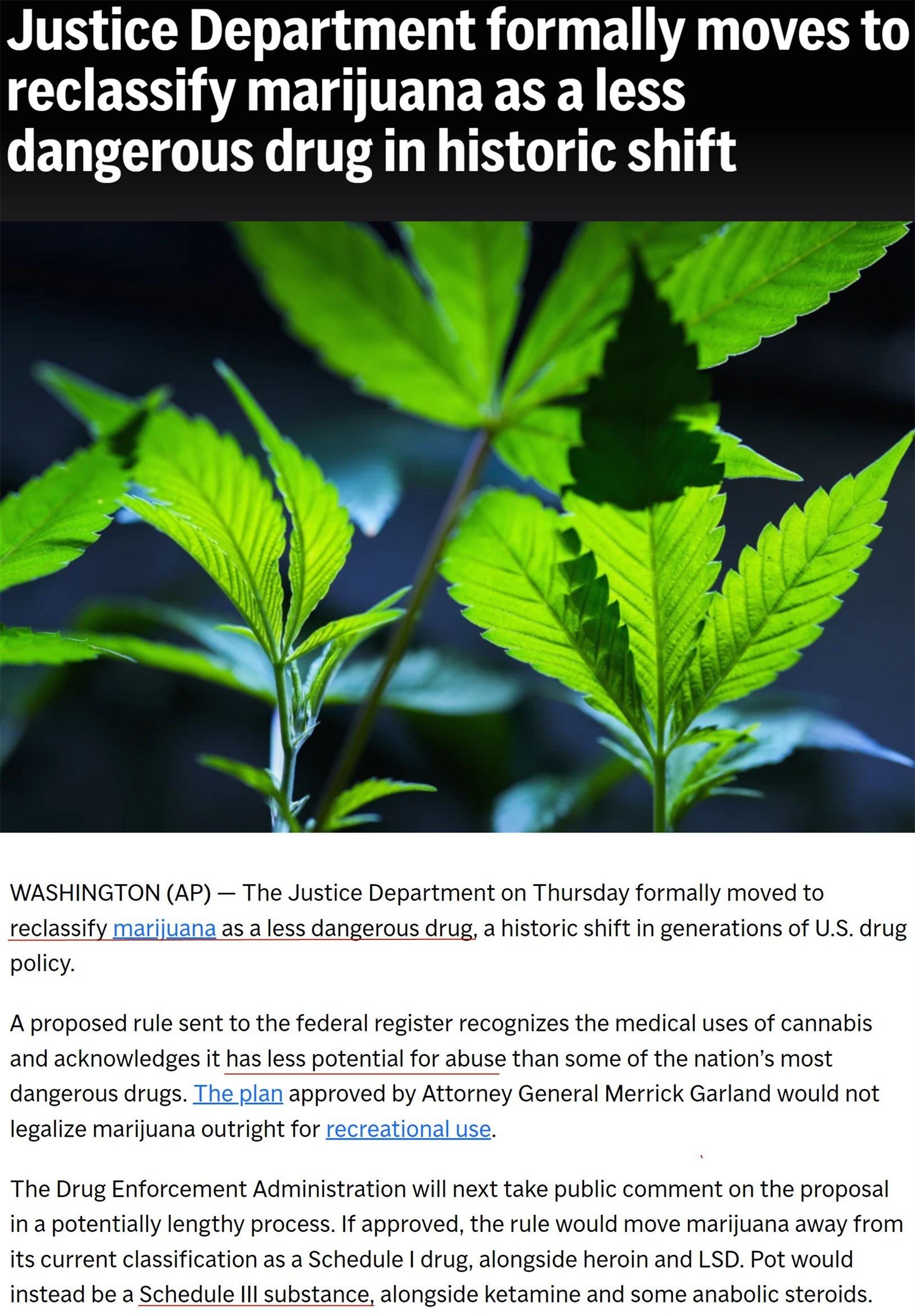 如果經(jīng)過(guò)60天的公眾意見(jiàn)征詢期后最終獲批,新規(guī)則雖然不會(huì)在聯(lián)邦層面將大麻完全合法化,但會(huì)將其移出《美國(guó)聯(lián)邦管制物質(zhì)法案》中列管海洛因等最危險(xiǎn)毒品的“附表一”,轉(zhuǎn)而歸入列管氯胺酮和類(lèi)固醇等危險(xiǎn)性較低藥物的“附表三”。