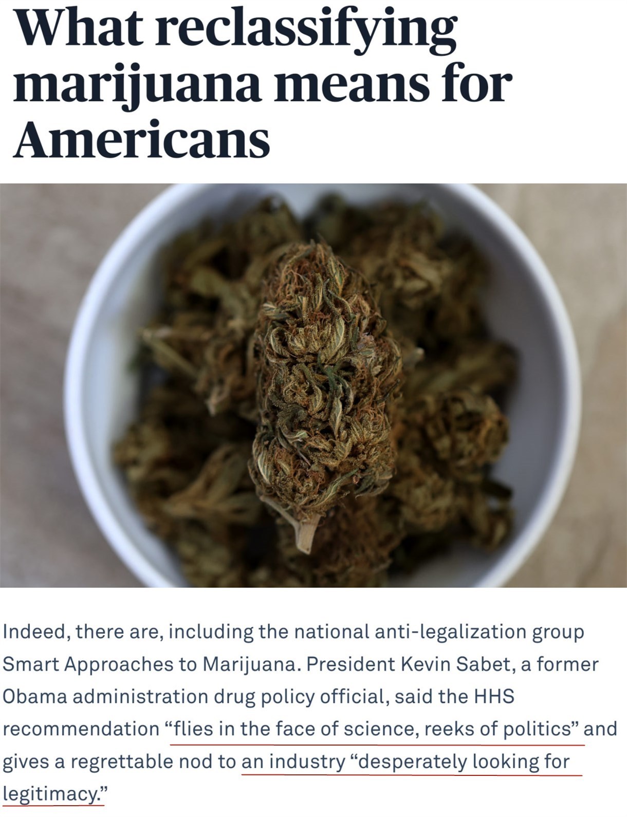 前白宮毒品政策官員凱文·薩比特批評(píng)稱(chēng),此舉“公然藐視科學(xué),帶有政治意味”,等于是承認(rèn)了一個(gè)“拼命尋求合法性”的行業(yè)。
