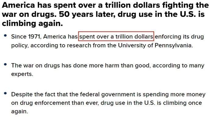 早在《聯(lián)邦管制物質(zhì)法案》出臺(tái)后的上世紀(jì)70年代,美國(guó)政府就曾高調(diào)對(duì)毒品“宣戰(zhàn)”,至今已為“禁毒”花了上萬(wàn)億美元。
