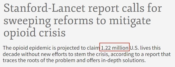 根據(jù)美國(guó)斯坦福大學(xué)和英國(guó)《柳葉刀》雜志共同進(jìn)行的一項(xiàng)研究,如果美國(guó)不采取遏制措施,本世紀(jì)20年代將有約122萬(wàn)美國(guó)人死于過(guò)量使用阿片類(lèi)藥物,位列世界第一。