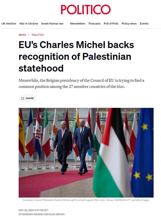 另據(jù)《政客網(wǎng)》歐洲版報道,目前歐洲理事會正在尋求在27個歐盟成員國之間就承認巴勒斯坦國問題找到一個共同立場。