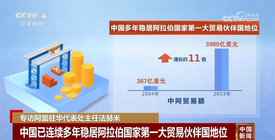 而在經(jīng)貿(mào)層面,中國已連續(xù)多年穩(wěn)居阿拉伯國家第一大貿(mào)易伙伴國地位,中阿貿(mào)易額從2004年的367億美元增至2023年的3980億美元,增長約11倍。特別值得一提的是,目前,全部22個阿拉伯國家和阿盟均同中方簽署了共建“一帶一路”合作文件。