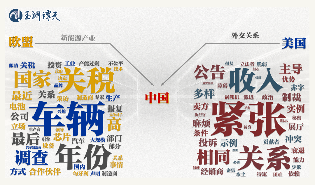 可以看到,以“車(chē)輛”“部門(mén)”“公司”“制造”等詞為代表的關(guān)鍵詞,都指向了新能源行業(yè)。相比之下,美國(guó)媒體對(duì)同一話(huà)題的討論,更側(cè)重“緊張”“關(guān)系”“沖突”“政治”等指向外交關(guān)系的關(guān)鍵詞。