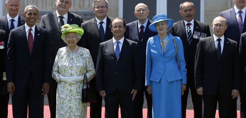 2014年6月6日,在法國貝努維爾,前來參加諾曼底登陸70周年紀(jì)念儀式的(前排左起)美國總統(tǒng)奧巴馬、英國女王伊麗莎白二世、法國總統(tǒng)奧朗德、丹麥女王瑪格麗特二世、俄羅斯總統(tǒng)普京等嘉賓合影。新華社/路透
