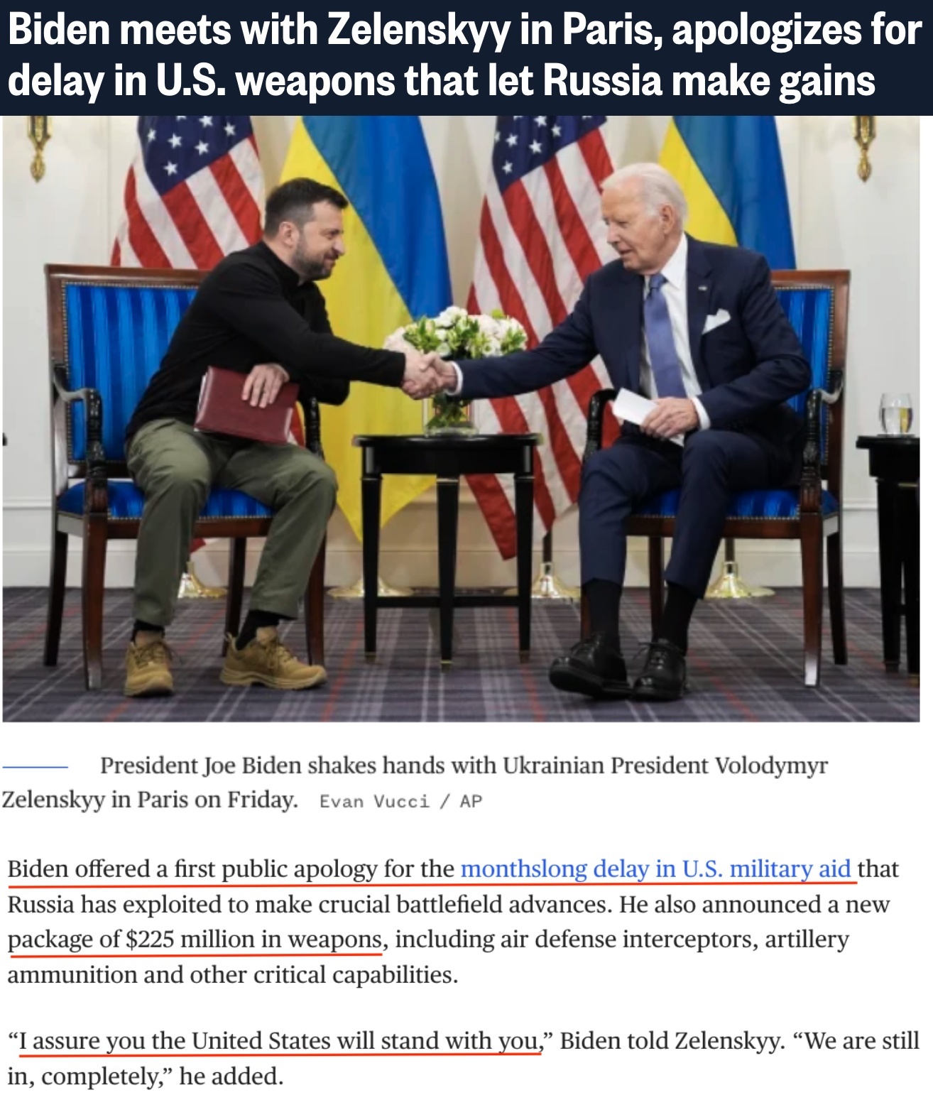 在巴黎會見烏克蘭總統(tǒng)澤連斯基時,拜登首次就美國國會未能更早通過對烏新援助法案“道歉”,并宣布將再向烏克蘭提供2.25億美元援助。