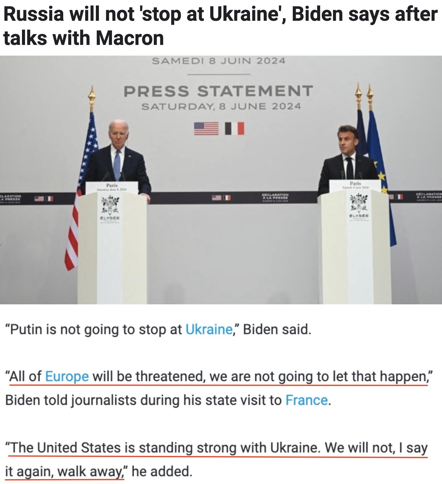 “俄羅斯不會止步于烏克蘭,整個歐洲都將受到威脅,我們不會讓這種情況發(fā)生……美國堅定地支持烏克蘭。我再說一遍,我們不會走開。”