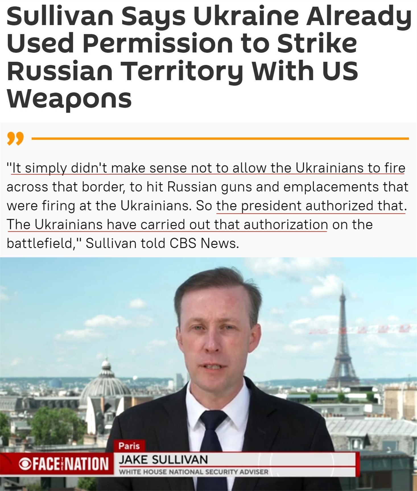 “它們(這些武器)被授權(quán)在(烏俄)邊境附近使用……我們沒有授權(quán)(烏克蘭)向俄羅斯境內(nèi)200英里(約合320公里)的地方發(fā)動襲擊,也沒有授權(quán)對莫斯科、克里姆林宮進行打擊。”