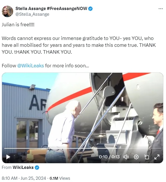 當(dāng)?shù)貢r(shí)間25日,朱利安·阿桑奇的妻子斯特拉在社交媒體上激動(dòng)地寫道,“言語無法表達(dá)我們對(duì)你們的感激之情——是的,就是你們,多年來,你們一直努力讓這一切成為現(xiàn)實(shí)。謝謝你們。謝謝你們,謝謝你們?!?/p>