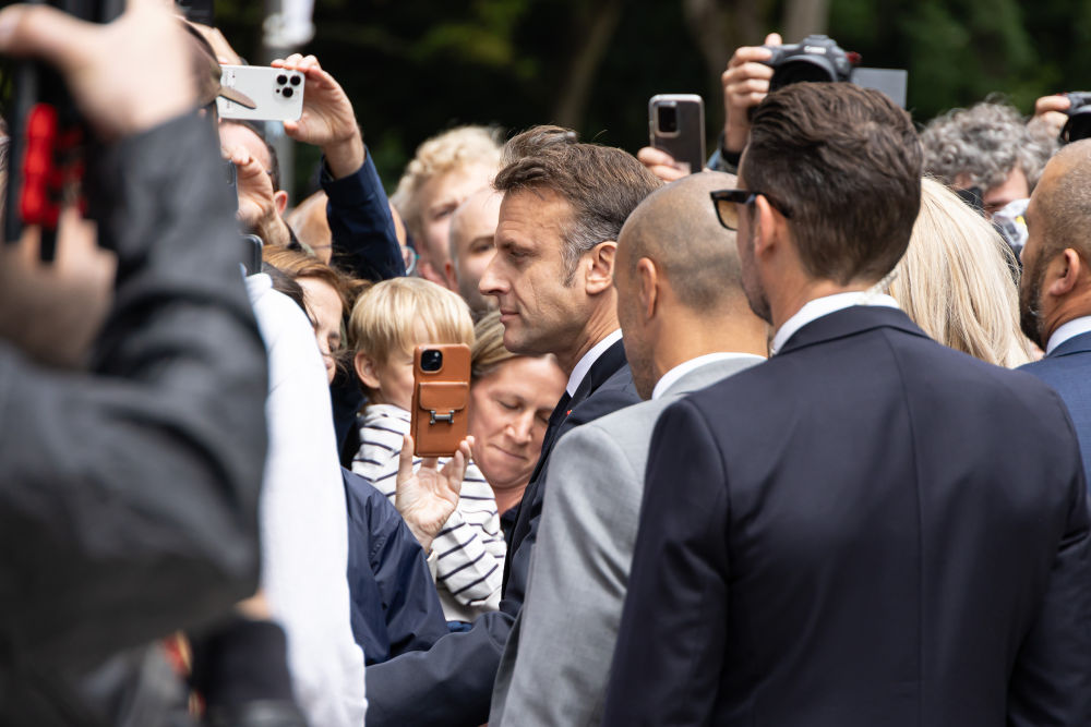7月7日,在法國勒圖凱,法國總統(tǒng)馬克龍在投票后與民眾交流。新華社發(fā)(弗蘭克·博阿姆攝)
