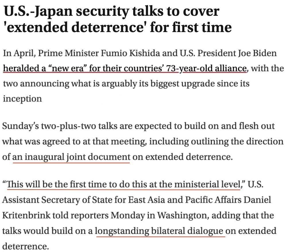 日本《讀賣新聞》援引未具名日本政府消息人士的話報道稱,日美兩國的目標(biāo)是在今年年內(nèi)出臺關(guān)于“延伸威懾”的首份聯(lián)合文件,其中將清楚地闡明“美國堅定不移捍衛(wèi)日本”的承諾。