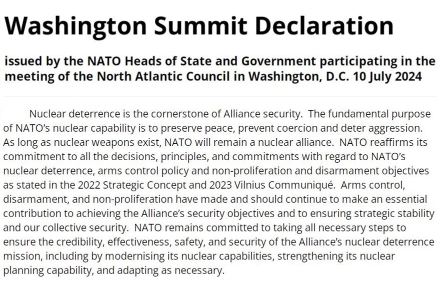 根據(jù)本月早些時候北約華盛頓峰會的最后聲明,作為威懾俄羅斯等戰(zhàn)略對手的重要措施之一,北約決定進一步強化核實力。