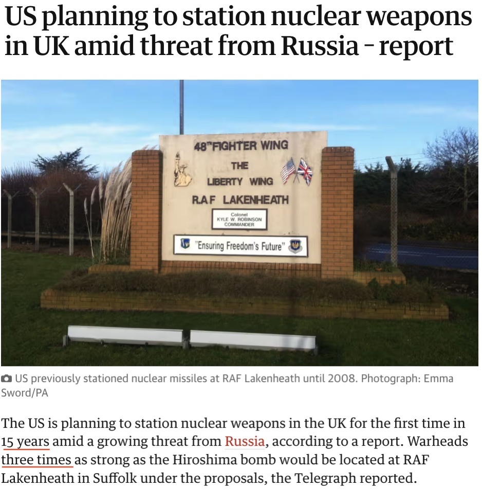 △英國《衛(wèi)報》:英國薩??丝だ舷K蓟始铱哲娀匦略O(shè)施的采購合同證實,美國打算在該空軍基地部署三倍于轟炸廣島原子彈威力的核彈頭。